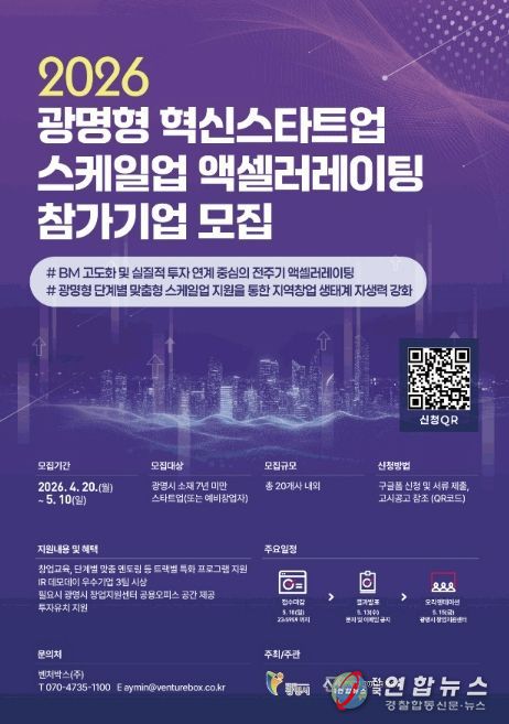 시는 오는 5월 10일까지 ‘2026년 광명형 혁신스타트업 스케일업 액셀러레이팅’ 참가기업을 모집한다.