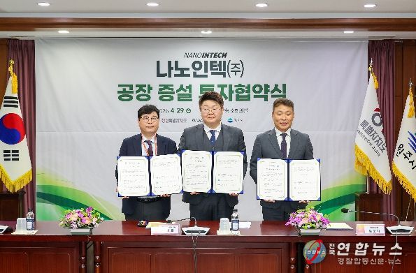 전국연합뉴스 유근택 기자 | 원주시와 강원특별자치도는 지난 29일 김문기 원주시장 권한대행, 심원섭 강원특별자치도 산업국장, 박병호 나노인텍㈜ 대표이사 등이 참석한 가운데 나노인텍㈜ 공장 증설을 위한 투자협약을 체결했다.