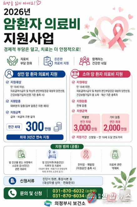 전국연합뉴스 박점규 기자 | 의정부시 보건소는 암환자의 경제적 부담을 완화하고 안정적인 치료 환경을 조성하기 위해 소아‧성인 암환자 의료비 지원사업을 추진하고 있다.