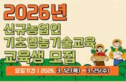 전국연합뉴스 김용태 기자 | 청양군이 최근 농어촌 기본소득 시행 등으로 급증한 신규 귀농인들의 안정적인 연착륙을 돕기 위해 영농 현장의 생생한 노하우를 전수하는 밀착형 지원에 나섰다. 군은 지난 12일, 신규 귀농인의 기술 습득과 영농 정착을 돕는 ‘2026년 선도농가 현장실습 교육’ 대상 8팀을 확정하고, 청양혁신플랫폼 와유에서 약정 체결 및 사전 교육을 실시하며 사업의 본격적인 시작을 알렸다. 이번 사업은 경험이 부족한 신규 귀농인(연수생)과 풍부한 영농 경험을 가진 베테랑 농업인(선도농가)을 1:1로 매칭해, 작물 재배 기술은 물론 농산물 가공·판매·마케팅 등 농업 경영 전반에 걸친 실전 지식을 전수하는 멘토링 프로그램이다. 특히 올해는 ‘청양군 농어촌 기본소득 시범 사업’ 시행 이후 귀농 희망자가 대폭 늘어남에 따라, 군은 관련 예산을 증액 편성하고 지원 규모를 지난해 5팀에서 8팀으로 확대해 귀농인들의 뜨거운 호응에 응답했다. 지난 12일 실시되는 교육에서는 본격적인 현장실습에 앞서 연수 과정에서의 유의 사항과 지원금 신청을 위한 시스템 활용법 등을 상세히 안내됐다. 또한 선도