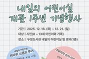 전국연합뉴스 김대환 기자 | 천안시 두정도서관은 오는 16~ 21일 ‘내일의 어린이실’ 개관 1주년 맞아 다채로운 기념행사를 운영한다고 15일 밝혔다. 도서관은 8~ 13세 어린이와 가족들을 대상으로 ▲내일의 어린이실 한바퀴 스탬프 투어 ▲1주년 축하 포토존 ▲내일이의 손이 머무른 책 전시 등을 선보인다. 개관일인 20일에는 어린이실에 방문하는 어린이들과 함께 축하 떡을 나누며 1주년의 의미를 함께 나눌 예정이다. 이와 함께 도서관 16주년과 크리스마스를 기념해 ‘반짝이는 리듬 케이크’ 타악기 콘서트와 특별 주문 케이크 만들기 등 다채로운 프로그램을 통해 1주년을 축하할 예정이다. 두정도서관 관계자는 “1주년 기념행사를 통해 어린이와 가족 모두가 행복한 시간을 보내기를 바란다”며 “내년에도 내일의 어린이실을 내실있게 운영할 수 있도록 노력할 것”이라고 말했다. 한편, 지난 11월까지 8만 3,000여 명의 어린이들이 내일의 어린이실을 이용했으며, 81개교 1,559명의 어린이가 회원으로 가입했다.