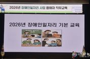 전국연합뉴스 김용태 기자 | 당진시는 지난 24일 당진시청 대강당에서 장애인일자리 사업 참여자 90여 명을 대상으로 ‘2026년 장애인일자리 사업 참여자 직무교육’을 실시했다고 25일 밝혔다. 이번 교육은 장애인일자리사업에 대한 이해도와 현장 업무 수행 능력을 높이기 위해 진행했다. 이날 교육에서는 사업 지침 및 복무규정과 관련된 강의와 함께 2026년 충청남도 장애인체육대회를 위한 선수 모집 등의 업무 공유를 했다. 장애인일자리 사업은 취업이 어려운 지역 장애인을 대상으로 양질의 일자리를 발굴․제공해 사회참여의 기회 제공과 소득 보장을 목적으로 추진하는 사업이다. 올해는 90여 명이 일반형 일자리와 복지형 일자리에 참여하고 있다. 시 관계자는 “이번 교육이 장애인일자리사업에 대한 이해의 시간이 됐길 바라며 각 배치기관에서 안정적인 직무 수행에 도움이 되길 바란다”고 말했다. 또한 “이번 기회를 통해 충청남도 장애인체육대회에 선수로 참여하게 된다면 좋은 결과 있기를 바란다”며 응원의 말을 전달했다.