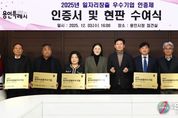전국연합뉴스 박남호 기자 | 용인특례시는 3일 본관 4층 전겹실에서 일자리 창출에 힘쓴 지역 우수기업 8곳에 인증서와 현판을 수여했다. 이번에 선정된 기업은 ▲아산디앤씨 주식회사 ▲일승푸드 제2공장 ▲주식회사 에이치에스씨 ▲㈜인실리코젠 ▲주식회사 홈체크 ▲㈜휴먼인텍 ▲케이제이건설산업(주) ▲트루션 등 총 8개사다. 시는 1차 서류심사와 2차 현장실사를 거쳐 일자리 창출 실적, 고용 안정성, 기업의 성장 가능성, 근로환경 등을 종합적으로 평가해 우수기업을 선정했다. 이들 기업은 최근 1년간 총 74명(기업당 4~19명)을 신규 채용해 지역 내 일자리 창출에 기여했다. 또, 다양한 직원복지제도로 근무하기 좋은 환경을 조성해 일자리의 질을 높이는 데 크게 힘쓴 것으로 평가됐다. 이들 기업에는 인증서와 현판이 수여되며, 시가 주최하는 일자리사업, 기업지원사업 참여 시 가점이 주어진다. 일자리박람회 등 채용 행사에도 우선적으로 참여할 수 있다. 용인특례시 일자리창출 우수기업 인증제는 2018년부터 시행되고 있으며, 매년 고용 확대와 일자리 창출에 기여한 기업을 발굴·지원하고 있다.