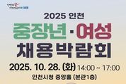 전국연합뉴스 박우배 기자 | 인천광역시는 중장년과 여성의 새로운 일자리 도전과 사회 참여 확대를 지원하기 위해 오는 10월 28일 인천시청 중앙홀에서 ‘2025 인천 중장년·여성 채용박람회’를 개최한다고 밝혔다. 이번 박람회는 올해 다섯 차례 진행된 ‘2025 인천 상설 채용박람회’의 마지막 일정으로, 인천시와 성평등가족부, 중부지방고용노동청 등 10개 기관이 공동으로 주최한다. 이번 행사에는 33개 기업이 참여해 현장 면접을 진행하고, 구직자들에게 실질적인 취업기회를 제공할 예정이다. 또한 채용관 외에도 ▲이력서 사진 촬영 ▲퍼스널컬러 진단 ▲인공지능(AI) 캐리커처 제작 등 구직자의 이미지 개선과 취업 경쟁력 향상을 위한 다양한 체험프로그램이 함께 운영된다. 연계행사로는 대회의실에서 ‘여성의 취·창업 역량 강화’를 위한 특별강연이 오전·오후로 두 차례 나뉘어 진행된다. 오전 1차 특강에서는 개그맨 출신 사업가 고명환이 강사로 나서 중장년층의 창업 전환을 주제로 실질적인 경험과 노하우를 전달하고, 오후 2차 특강에서는 과학 유튜버‘궤도’가 디지털 리터러시 향상과 인공지능(AI)을 활용