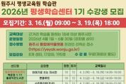 전국연합뉴스 유근택 기자 | 원주시 평생교육원 학습관은 3월 16일부터 19일까지 2026년 평생학습센터 1기 수강생을 모집한다. 평생학습센터는 평생교육법에 따라 지자체가 지정·운영하는 지역 평생학습 거점으로, 주거지 인근에서 지역 주민의 수요를 반영한 다양한 평생학습 프로그램을 운영하는 학습공간이다. 지역별 특색을 반영한 프로그램을 통해 주민 참여를 확대하고, 지역공동체 형성에 기여할 것으로 기대된다. 1기 프로그램은 실버 체력 증진교실, 문해력 키우는 그림책, 베이직 요가 등 총 17개 강좌를 운영한다. 교육 기간은 4월 1일부터 6월 30일까지며, 강좌별로 총 4회에서 12회차까지 진행된다. 한편 학습관은 올해 흥업평생학습센터를 추가로 지정했으며, 이와 함께 지정·호저·신림 등 면 단위 평생학습센터와 그림책평생학습센터, 여성친화평생학습센터, 우물마을평생학습센터 등 지역 특색을 반영한 평생학습센터를 운영하고 있다.