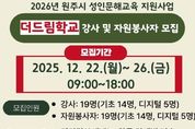 전국연합뉴스 유근택 기자 | 원주시 평생교육원 학습관에서 12월 22일부터 26일까지 2026년 원주시 성인문해교육 지원사업 '더드림학교' 강사 및 자원봉사자를 모집한다. 이번 문해교육 강사는 학령기 교육의 기회를 놓친 비문해 성인을 대상으로 더디딤 6개반, 더채움(성인생활문해) 5개반, 더열림(찾아가는 성인문해교실) 3개반, 더터치(디지털문해) 5개반 등 전문적인 문해교육을 수행할 교육강사 19명, 자원봉사자 19명, 총 38명을 모집한다. 지원자는 신청서를 작성해 평생교육원 학습관에 방문 접수하면 되고, 선발은 1차 서류 심사와 2차 면접 및 수업 시연으로 이루어진다. 심사에서는 ▲강사 경력 및 자격 ▲강좌 운영 적합성 ▲지원자의 전문성 ▲강의 계획의 적정성 ▲강의 능력 등을 종합적으로 평가해 최종 합격자를 선정한다. 윤석재 학습관장은 “비문해 어르신들에게 질 높은 문해교육을 제공하여 학습자들의 자존감 향상에 기여할 역량 있는 강사와 자원봉사자의 많은 관심과 참여를 기대한다.”라고 말했다.