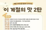 전국연합뉴스 유근택 기자 | 원주시 동부복합생활지원센터는 오는 11월 3일부터 ‘이 계절의 맛 2탄’ 건강 요리 교실 프로그램 참여자를 모집한다. 이번 프로그램은 제철 식재료를 활용해 면역력과 활력을 높이는 건강 요리 실습을 통해 지역 주민들의 건강하고 균형 잡힌 식습관 형성을 돕는다. 교육은 11월 12일부터 12월 3일까지 매주 수요일마다 총 4회에 걸쳐 영양교육 및 요리 실습이 열린다. 프로그램은 오전 10시 30분부터 11시 30분까지 한 시간 동안 진행된다. 모집 인원은 20명이며, 11월 3일 오전 9시부터 11월 7일(금)까지 선착순 모집한다.