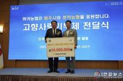 전국연합뉴스 유근택 기자 | 제주 하귀농협은 고향사랑기부제 활성화를 위해 지난 9일 원주시 고향사랑기부제에 동참했다. 이날 하귀농협 임직원들은 원주시 지역사회에 따뜻한 마음을 전달하기 위해 뜻을 모아 1천만 원을 기부했다. 이번 기부는 원주 문막농협과 제주 하귀농협이 2015년 맺은 자매결연 10주년을 기념하기 위해 이뤄졌으며, 지역 간 상생협력의 모범 사례가 될 것으로 기대된다. 강병진 하귀농협 조합장은 “10년 동안 이어온 소중한 인연을 앞으로도 더욱 깊게 이어가고, 지역 상생발전에 함께 기여하겠다”라고 전했다. 곽후신 문막농협 조합장은 “지속적인 교류를 통해 상생 발전할 수 있길 바란다”라고 말했다.