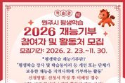전국연합뉴스 유근택 기자 | 원주시 평생교육원 학습관은 오는 11월 말까지 2026년 원주시 평생학습 재능기부 참여자 및 활동처를 수시 모집한다. 재능기부 참여자는 평생교육 강사, 학습동아리 등 자신의 재능을 무보수로 나눠주고 싶은 개인 또는 팀이다. 재능기부 활동처는 프로그램 참여를 희망하는 관내 경로당과 요양원, 복지관 등 관람 인원이 15명 이상인 곳이다. 학습관은 오는 4월부터 11월까지 매달 희망 활동처 2곳과 재능기부 팀 1∼3곳을 연계해 프로그램을 운영할 계획이다. 모집 기간은 2월 23일부터 11월 30일까지다. 학습관 또는 원주시 통합예약플랫폼 홈페이지에서 서식을 내려받아 작성한 후, 이메일 제출하면 신청할 수 있다. 자세한 사항은 학습관 평생교육팀으로 문의하면 된다. 윤석재 학습관장은 “평생학습으로 배운 재능을 지역의 소외계층과 함께 나눔으로써 재능기부 문화를 활성화할 수 있도록 많은 관심과 참여를 부탁드린다”라고 말했다.