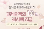전국연합뉴스 조민준 기자 | 광명시가 5월 가정의 달을 맞아 가족 외식은 즐겁게, 골목상권은 활기차게 만드는 특별한 캐시백 혜택을 제공한다. 시는 오는 5월 1일부터 5월 한 달간 음식점·카페에서 광명사랑화폐로 결제하는 경우 결제 금액의 10%를 환급하는 ‘가족 외식비 캐시백 지원사업’을 추진한다고 28일 밝혔다. 이번 사업은 고물가 상황에서 외식 수요가 집중되는 가정의 달을 맞아 시민들의 가계 부담을 실질적으로 덜어주는 한편, 소비 침체로 어려움을 겪는 지역 소상공인을 돕기 위해 마련했다. 캐시백 혜택은 광명사랑화폐 가맹점 중 음식점과 카페에서 결제할 때 적용된다. 특히 지역화폐 사용처를 오는 8월 31일까지 고유가 피해지원금 기준에 맞춰 연매출 30억 원 이하 업체까지 한시적으로 확대하면서, 가족 외식비 캐시백 혜택을 받을 수 있는 가맹점 범위도 함께 넓어졌다. 결제액(인센티브, 정책수당 결제분 제외)의 10%를 1인당 최대 1만 원까지 광명사랑화폐로 즉시 환급받을 수 있으며, 준비된 예산이 소진하는 경우 조기 종료한다. 지급된 캐시백은 지급일로부터 1개월 이내 사용해야