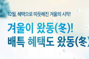 전국연합뉴스 조민준 기자 | 경기도와 경기도주식회사가 공동 운영하는 경기도 공공배달앱 배달특급이 겨울을 맞아 12월 한 달간 ‘겨울이왔동(冬)’ 소비자 할인 프로모션을 진행한다. ‘겨울이왔동(冬)’ 소비자 할인 이벤트는 ‘통 큰 세일’ 프로모션 종료 등으로 아쉬움이 남는 소비자들의 편익을 증대하기 위해 마련했다. 배달 특급 전체 회원, 전체 서비스 지역을 대상으로 1만2천원 주문에 사용가능한 3천원 할인 쿠폰을 예산 소진시까지 1일 1인 1회 지급한다. 한편 배달특급의 모든 이벤트는 해당 상단 배너 기능을 통해 확인 가능하며, 지역에 따라 할인 조건과 금액이 달라질 수 있어 사전 확인이 필요하다.