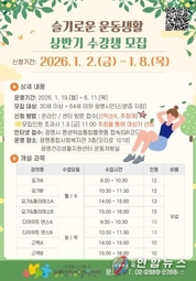 전국연합뉴스 조민준 기자 | 광명시 광명건강생활지원센터는 새해를 맞아 시민들의 건강한 생활습관 형성과 만성질환 예방을 위해 2026년 상반기 ‘슬기로운 운동생활’ 운동 프로그램 참여자를 모집한다. ‘슬기로운 운동생활’은 요가, 다이어트 댄스, 근력운동 등 다양한 프로그램으로 구성돼 있으며, 전문 강사의 지도를 통해 시민들이 꾸준한 운동 습관을 형성하고 건강한 일상을 유지할 수 있도록 돕는다. 프로그램은 2026년 1월 19일부터 6월 11일까지 광명건강생활지원센터에서 운영한다. 참여 신청은 2026년 1월 2일 오전 9시부터 1월 8일 오후 6시까지 가능하다. 광명시 평생학습통합플랫폼 ‘광명e지’에서 온라인으로 신청하거나, 신분증을 지참해 광명건강생활지원센터로 방문 신청하면 된다. 특히 올해부터는 기존의 선착순 모집 방식이 ‘추첨제’로 변경해 참여 기회를 보다 공정하게 제공할 예정이다. 모집 인원을 초과할 경우 1월 9일 오전 11시 추첨으로 대상자를 선정하며, 결과는 개별 문자로 안내한다. 나기효 건강위생과장은 “새로운 한 해를 맞아 작은 운동 습관이 시민들의 건강에 큰 변화를 가져올