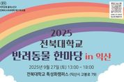 전국연합뉴스 최성용 기자 | 반려동물과 시민이 함께 즐기는 축제가 반려동물 친화관광도시 익산에서 열린다. 익산시는 '2025 전북대학교 반려동물 한마당'이 오는 27일 오후 1시 전북대학교 익산특성화캠퍼스에서 다채롭게 펼쳐진다고 22일 밝혔다. 이번 행사는 전북대학교 수의과대학이 주최하며, 반려인과 시민 모두가 즐길 수 있는 풍성한 볼거리와 체험거리를 선보인다. 행사장에서는 △멍냥 그립톡 만들기 △발도장 추억액자 △반려동물 건강검진 등 체험 부스가 운영된다. 또 반려동물 산책룩 펫션쇼와 OX 퀴즈, 사진 콘테스트 등 무대 프로그램이 마련돼 현장 열기를 더한다. 아울러 전북대 수의과대학 박철 교수와 윤지선 교수의 강연으로 유익한 정보를 전달하고, '일일 수의사 체험'을 통해 미래 수의사를 꿈꾸는 청소년들에게 특별한 진로 경험도 제공한다. 방문객들에게는 리유저블백, 텀블러, 부채 등으로 구성된 기념 선물이 주어진다. 이 밖에도 부스별 스탬프 투어와 이벤트 무대 프로그램을 통해 제공되는 펫 드라이기, 자동 급식기, 강아지 유모차, 카시트 등 푸짐한 경품도 현장의 즐거