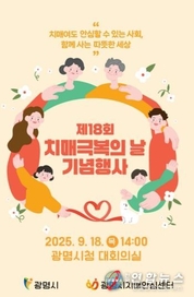 전국연합뉴스 조민준 기자 | 광명시는 오는 18일 광명시청 대회의실에서 ‘제18회 치매극복의 날’ 기념식을 개최한다. 이번 기념식은 ‘치매여도 안심할 수 있는 사회, 함께 사는 따뜻한 세상’을 슬로건으로, 개인과 가족은 물론 이웃과 지역사회가 함께 어울리며 치매를 극복할 수 있다는 메시지를 담고 있다. 특히 광명시치매안심센터에서 운영하는 ‘기품합창단’이 무대에 올라 합창 공연을 펼칠 예정이며, 시민 150여 명이 함께할 것으로 기대된다. 치매 환자와 가족이 무대에 올라 함께 공연함으로써 치매에 대한 편견을 없애고, 지역사회가 하나 되는 뜻깊은 자리가 전망이다. 또한 행사장에서는 시민들이 즐길 수 있는 치매 퀴즈와 레크리에이션이 진행돼 치매에 대한 이해를 높일 수 있도록 했으며, 입구에는 치매관리사업 홍보 부스와 포토존 등 다양한 부대 행사도 마련한다. 광명시 제18회 치매극복의 날 기념행사 참여를 희망하는 시민은 광명시치매안심센터로 문의하면 자세한 안내를 받을 수 있다.