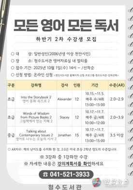 천안시 청수도서관, 10~ 11월 ‘모든 영어 모든 독서’ 운영
