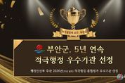 전국연합뉴스 최성용 기자 | 부안군은 행정안전부에서 주관한 2026년(2025년 실적) 지방정부 적극행정 종합평가에서 우수기관으로 선정돼 지난 2021년 하반기 성과 점검부터 5년 연속 우수기관 선정이라는 금자탑을 쌓았다고 밝혔다. 행정안전부 발표에 따르면 군은 전국 243개 지방정부(광역 17개, 기초 226개)를 대상으로 한 이번 평가에서 우수한 성적을 거둬 전북특별자치도 시‧군 중 유일하게 5년 연속 적극행정 우수기관으로 선정되는 영예를 안았다. 이번 성과는 일시적인 결과가 아니라 지난 5년간 꾸준히 이어온 행정 혁신의 결실이라는 점에서 의미가 깊다. 군은 2022년(21년 하반기 성과 점검) 선정을 시작으로 2023년(2022년 실적), 2024년(2023년 실적), 2025년(2024년 실적)에 이어 올해 2026년(2025년 실적) 평가까지 단 한 차례도 거르지 않고 우수기관 타이틀을 지켜냈다. 특히 2024년과 2025년에는 상반기 적극행정 성과 점검에서도 잇따라 우수기관으로 선정돼 행정안전부 장관상을 수상하는 등 전국 최고 수준의 업무 역량을 증명해 왔다. 이번 평가는 적