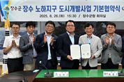 전국연합뉴스 최성용 기자 | 장수군 장수읍 노하리 일원 노하지구를 약 490세대가 거주할 명품 주거단지로 공동개발하기 위한 ‘장수군 노하지구 도시개발사업’에 속도가 붙을 전망이다. 장수군은 지난 26일 군청 2층 회의실에서 최훈식 장수군수와 김대근 전북개발공사 사장 등 양 기관의 관계자들이 참석한 가운데 공동사업시행자인 전북개발공사와 ‘장수군 노하지구 도시개발사업’ 추진을 위한 기본협약을 체결했다. 노하지구 도시개발사업은 장수읍 노하리 일원 89,304㎡ 부지에 전북개발공사 주도로 총사업비 426억 원을 투입해 약 490세대 규모의 공동주택용지와 준주거용지 등을 조성하고 도로, 공원 녹지 등 기반 시설이 들어서는 신규 도심 개발 사업이다. 이날 협약은 지난해 12월 양 기관이 체결한 지역발전 상호협력 협약의 연장선으로 협약 당사자 간 책임과 역할을 보다 구체화하고 사업을 성공적으로 수행하는 데 양 기관이 뜻을 함께했다. 협약의 주요 내용으로는 장수군에서는 △사업지구 지정 및 개발계획 등 각종 인허가 행정지원, △사업부지 보상협의 지원 등이며, 전북개발공사에서는 △사업지구 지정 및 개발계획 수립, △