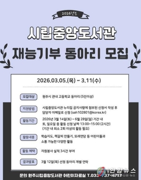 원주시립중앙도서관, 상반기 청소년 재능기부 동아리 모집