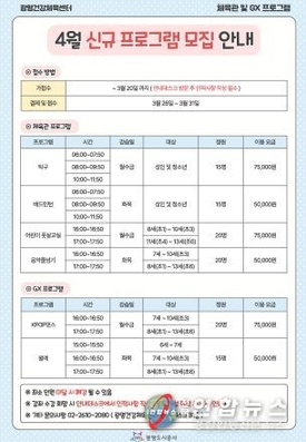 광명도시공사 광명건강체육센터, 체육관·GX실 4월 신규 프로그램 회원 모집