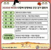 전국연합뉴스 조민준 기자 | 광명시는 시민들의 건강한 생활습관 형성과 걷기 문화 확산을 위해 ‘제13회 다함께 광명해요 건강 걷기 챌린지’를 진행한다. 이번 챌린지는 오는 11월 1일부터 15일까지 15일간 열리며, 광명시민과 광명시에 소재한 직장인이면 누구나 참여할 수 있다. 참가자는 기간 동안 총 10만 보를 걸으면 되며, 1일 최대 1만 보까지만 인정된다. 참여 방법은 간단하다. 10월 29일부터 워크온(WalkOn) 앱을 설치하고 광명시 공식 커뮤니티에 가입한 뒤 ‘제13회 건강 걷기 챌린지 참여하기’를 눌러 걷기를 시작하면 된다. 단, 목표 걸음을 달성한 시민은 ‘응모하기’ 버튼을 눌러 참여를 완료하면 된다. 누적 걸음 수 목표를 달성한 참여자 중 추첨으로 100명에게 모바일 문화상품권 5천 원권 1매를 지급한다. 당첨자 발표와 상품 지급은 11월 17일부터 11월 21일까지 진행할 예정이다. 나기효 건강위생과장은 “매회 많은 시민이 참여하는 ‘다함께 광명해요 건강 걷기 챌린지’는 일상 속 건강한 습관을 형성할 좋은 기회다”며 “시민들이 걷기를 통해 건강도 챙기고, 작은 선물도